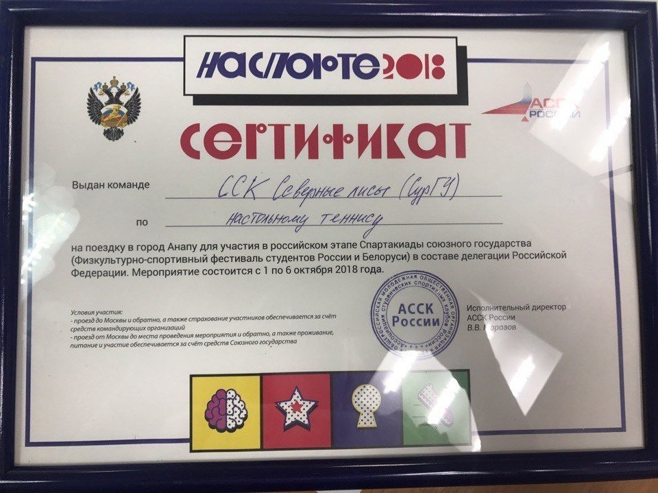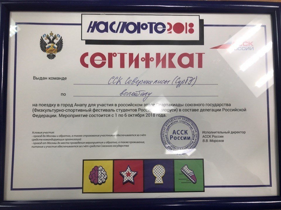 Благодаря триумфальной победе на чемпионате, студенты СурГУ получили путевку на Спартакиаду союзного государства — физкультурно-спортивный фестиваль студентов России и Белорусии, в составе делегации Российской Федерации, которая пройдет с 1 по 6 октября 2018 года в Анапе.