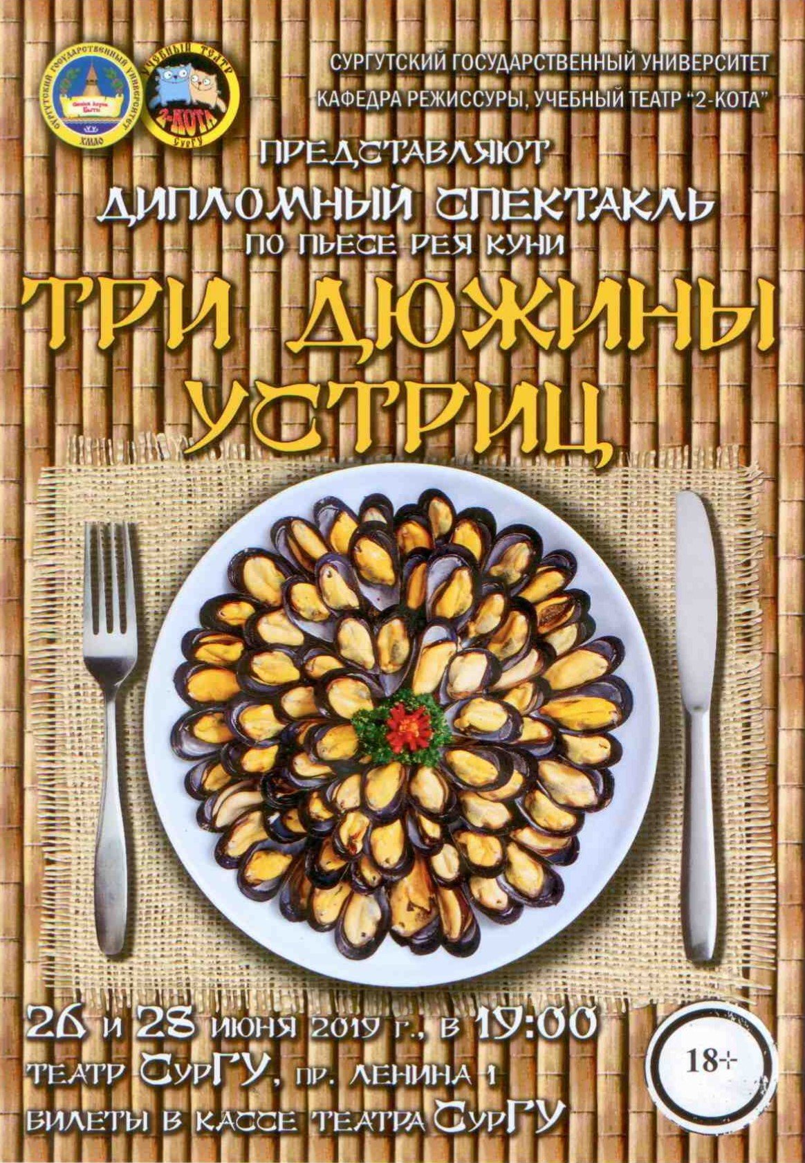 26 и 28 июня в студенческом театре СурГУ пройдёт премьера дипломного спектакля 4 курса направления подготовки «Народная художественная культура» «Три дюжины устриц» по пьесе Рея Куни «Он, она, окно, покойник»