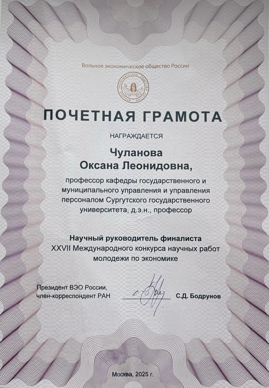 В рамках съезда за подготовку студента – финалиста XXVII Международного конкурса научных работ молодежи по экономике c исследованием на тему «Разработка инструментов применения бионического подхода в развитии талантов организации», награжденного дипломом в специальной номинации «За вклад в разработку социально значимого регионального проекта», профессор Оксана Чуланова была отмечена Почетной грамотой Вольного экономического общества (исследование выполнено за счет гранта Российского научного фонда, проект № 25-28-20474).