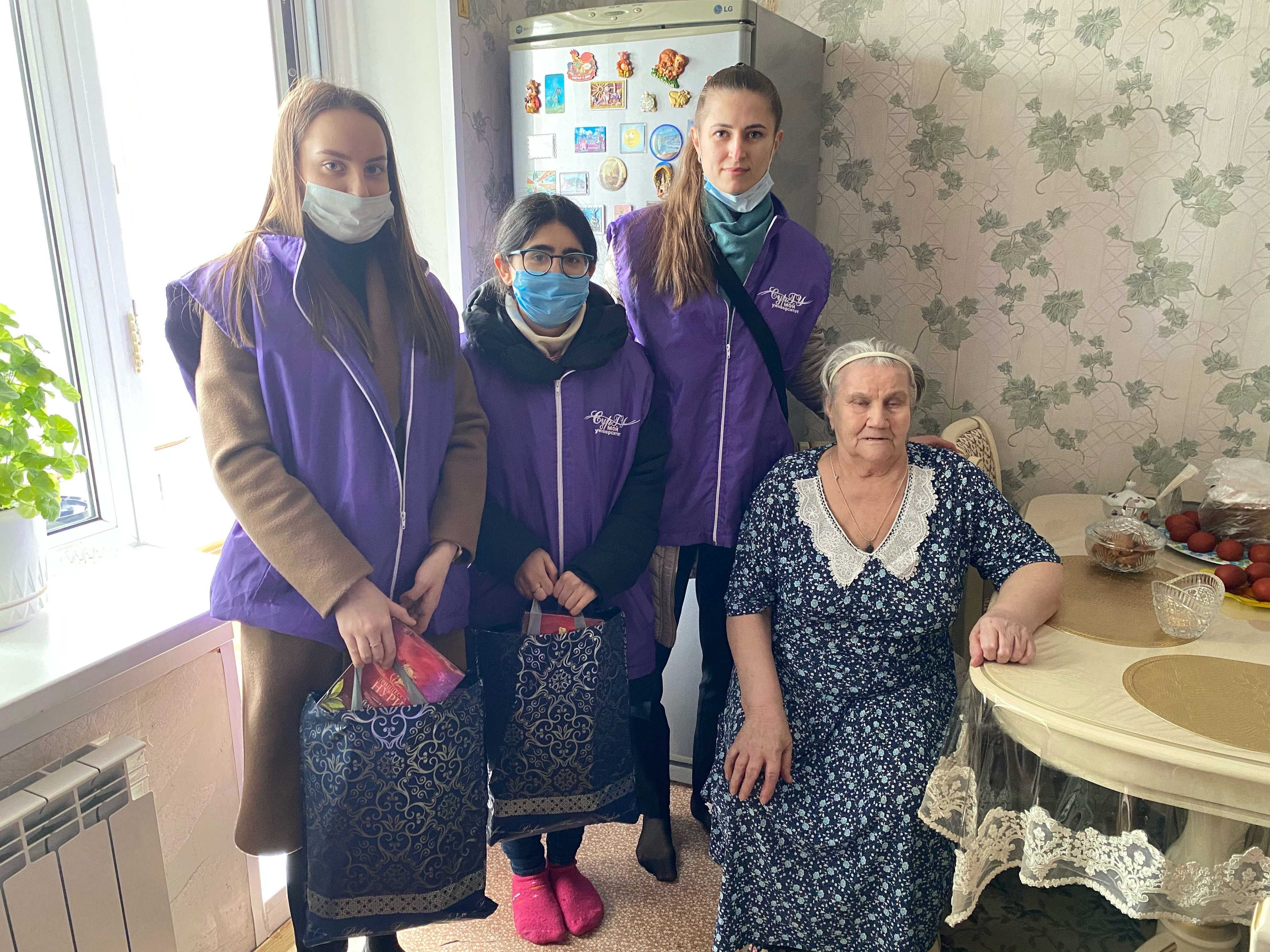 В рамках дистанционного проекта «Добро спасет мир» прошла очередная акция «СПАСИБО ВЕТЕРАНАМ», посвященная 76-летию Победы. Студенты-волонтеры направления «Лингвистика» ИГОиС СурГУ под руководством преподавателей кафедры лингвистики и переводоведения доцента Таджибовой Аксаны, доцента Коптяковой Елены, старшего преподавателя Завьяловой Юлии, куратора Сало Виктории, доцента Яковец Татьяны и при содействии председателя совета ветеранов города Сургута Светланы Михайловны Иост с 1 по 5 мая текущего года навестили и поздравили 16 ветеранов Великой Отечественной войны, тружеников тыла, вдов ветеранов ВОВ с замечательными весенними праздниками. Благодаря гранту губернатора Н. В. Комаровой волонтеры приобрели и подарили постельные принадлежности и продуктовый набор.